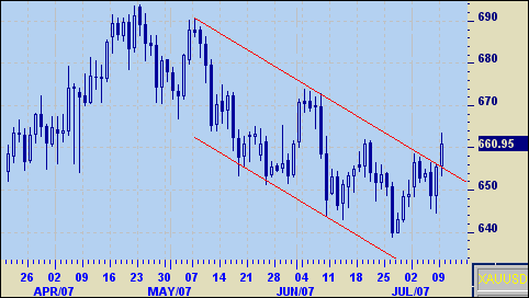 На торгах в понедельник золото смогло воспользоваться сохраняющимся эффектом слабости доллара США на валютном рынке, а также ростом нефтяных котировок, чтобы достичь максимальных уровней за месяц. В ходе торгов на Comex (division NYMEX) августовские фьючерсы на золото выросли в стоимости на 7.7 доллара до 662.50 долларов за тройскую унцию. Основную роль в росте цен этого драгоценного металла сыграли фонды, а не физический спрос. Как известно, среди товарно-сырьевых активов золото является наиболее техническим активом, поскольку в операциях с ним очень высока спекулятивная составляющая. К активным покупкам таких участников рынка, как фонды, стимулировало техническое пробитие верхней линии нисходящего коррекционного канала, что формирует предпосылки для начала новой волны глобального восходящего тренда.