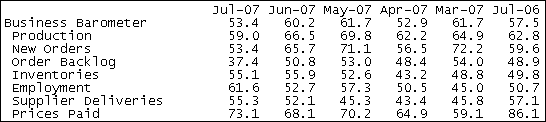 Индекс Chicago PMI в июле достиг 53.4 пункта, оказавшись хуже прогноза 58 и 60.2 в июне, при этом индекс уплаченных цен составил 73.1 по сравнению с 68.1 ранее, а индекс занятости вырос с 52.7 до 61.6 пункта. Индекс новых заказов, между тем, продолжил снижение и достиг 53.4 пункта против 65.7 в июне и 71.1 в мае, в то время как нисходящую динамику продемонстрировал и индекс производства: 59 пунктов в июле против 66.5 ранее. Индекс запасов упал с 55.9 до 55.1 пункта. ProFinance.Ru - Forex News / Новости Форекс