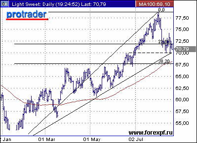 Сообщения о том, что государственный нефтеперерабатывающий завод Petrojam на Ямайке прекратил производство в связи с приближением урагана Дин, приободрили быков на рынке нефти, поддержав восстановление цен с минимумов сессии. Октябрьский фьючерс на нефть марки light sweet на Nymex, достигнув отметки $70.46, в настоящее время торгуется около $70.65 неся, тем не менее, потери в 1.66%, учитывая, что, хотя урагану и присвоена категория "чрезвычайно опасный", угроза для американских НПЗ в мексиканском заливе расценивается как незначительная. Настрой на рынке "черного золота" остается нервозным: несмотря на "инъекции" центральных банков и рост рынка акций, инвесторы предпочитают покидать длинные позиции, и, как считает Тим Эванс из Citigroup, на данный момент "больше шансов увидеть дальнейшую ликвидацию лонгов, нежели возобновление покупок". Нефти, тем не менее, удается держаться выше поддержки в районе $70, что поддерживает надежды на возобновление роста, однако прорыв ниже аптренда с минимумов января будет негативным событием для быков и откроет дорогу первоначально к $68.10/67.80 за баррель. ProFinance.Ru - Forex News / Новости Форекс