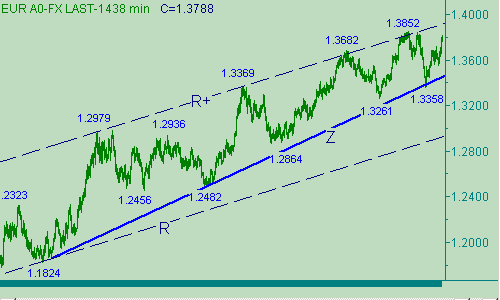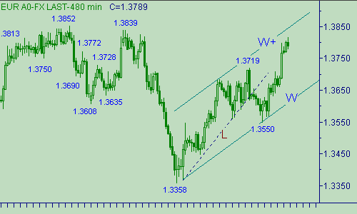 Рабочая модель - канал W-W+ на рис. 2, более точно - второе восходящее движение (с началом от 1.3550(04/09/07)) в этом канале. Ожидаем развития коррекции евро/доллара от его роста от 1.3661(07/09/07) и пытаемся поставить позицию на покупку, предполагая дальнейшее развитие восходящего движения курса в канале B-B+ и попадания пары в область, находящуюся около фигуры 1.3900. Будем пытаться использовать перечисленные выше уровни (1.3750, 1.3720, 1.3680) для открытия позиции на покупку, но саму позицию откроем только один раз и далее используем тактику частичного закрытия позиции для переноса стоп-лосса. Если после открытия позиции стоп-лосс перенести не удастся (закрытие по стоп-лоссу), то более покупок не будем открывать. Более конкретно, в случае теста парой уровня 1.3755 открываем позицию на покупку со стоп-лоссом, расположенным на 1.3714, цель - 1.3895. В случае, если после открытия позиции курс поднимется до отметки 1.3784 закрываем половину позиции с прибылью, а стоп-лосс перенесем на отметку 1.3677. Далее при падении цены до 1.3721 снова открываем позицию на покупку (объем - половина от ранее открытой позиции), после чего при появлении на экране терминала котировки 1.3750 снова закрываем половину позиции, а стоп-лосс переносим на 1.3649. Целевая область остается на уровне 1.3895. В случае продолжения восходящего движения евро/доллара ищем возможность для открытия продаж от 1.3895.
