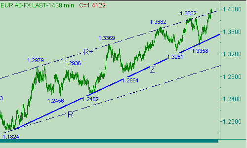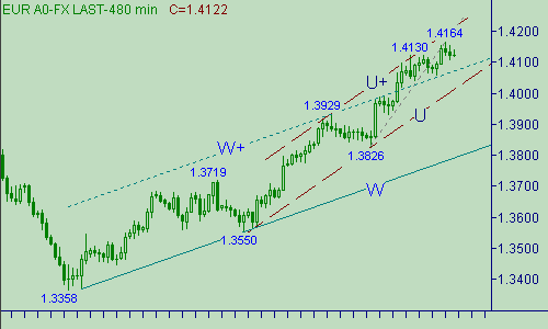 Если же рассматривать возможности продолжения восходящего движения (убедительный прорыв евро выше области 1.4160/75), то оно может временно завершиться, формированием как локальных так и "глобальных" нисходящих откатов, с началом, расположенным в следующих областях: 1.4160/75, 1.4190/1.4210, 1.4240/50, 1.43260/70, 1.4390/1.4400.