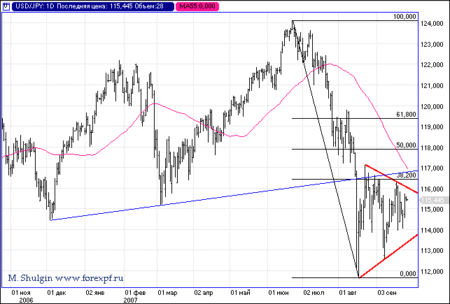 Пока общая техническая картина носит медвежий характер. Поэтому мы будем рассматривать открытие коротких позиций нескольким ниже верхней линии треугольника с первоначальной целью на 114.30 и последующей целью на 108.00. Однако в том случае, если наши ожидания окажутся не верны, мы незамедлительно покинем короткую позицию в паре доллар/иена в том случае, если закрытие какого-либо из дней будет выше верхней линии треугольника. Более того, если курс поднимется выше 116.50, мы откроем длинную позицию по доллару против иены с целью в районе 118.50/119.00. Михаил Шульгин ProFinance.Ru - Forex News / Новости Форекс