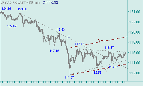 Из написанного выше понятно почему нам не хочется открывать позиции на покупку. Продавать можно пробовать от 116.00/10 со стоп-лоссом на 116.41, цель - нижняя граница треугольника на рис. 2 (114.40). Пока остаемся вне рынка и отслеживаем за развитием модели треугольника на рис. 1.