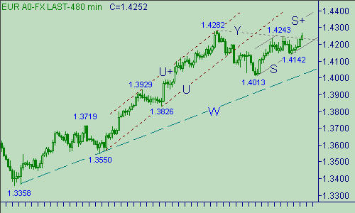 Если подытоживать написанное выше: пока курс остается ниже 1.4325 вроде как лучше продавать евро за доллары, но если рассматривать канал S-S+, то хочется в нем купить европейскую валюту. Долго мучиться не будем, а сделаем так: в случае теста парой уровня 1.4320 будем открывать продажи минимальным объемом со стоп-лоссом на 1.4341 (стоп-лосс или не большой или совсем не открывать позицию), цель - 1.4050. Если после открытия позиции котировки опустятся до 1.4205 стоп-лосс перенесем на 1.4220.