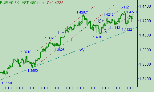 Для открытия позиций наиболее привлекательными выглядят уровни 1.4345 и 1.4100. Находящиеся между этими ценами другие области поддержки и сопротивления менее привлекательны для практического их использования, так как текущую ситуацию мы рассматриваем как процесс формирования евро/долларом коррекции от его восходящего движения в канале S-S+ на рис. 2, а как известно существует множество разновидностей коррекционных формаций. На фоне неясностей в наших умах пока остережемся открывать позиции от ближайших из приведенных ниже уровней поддержки и сопротивления. Но поставим ордера на уровни 1.4345 и 1.4085. В случае теста парой уровня 1.4345 будем открывать позиции на продажу со стоп-лоссом на 1.4366, цель - 1.4110. При тесте курсом уровня 1.4085 откроем позиции на покупку с целью на 1.4270
