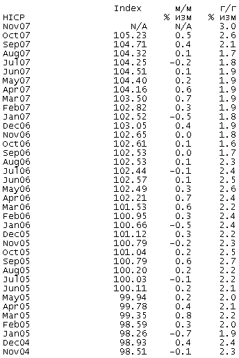 Опубликованный сегодня отчет Eurostat по инфляции в Еврозоне показал, что в ноябре гармонизированный индекс цен потребителей вырос на 3.0%, что превзошло средний прогноз аналитиков в +2.8% и оказалось выше +2.6%, зафиксированные в предыдущем месяце. Ноябрьское значение индекса стало максимальным после 3.1% в мае 2001 года, и, в то время как в ЕЦБ ожидали увидеть эффект роста цен на энергоносители и продукты питания, полагая, что он будут временным и уменьшится во втором полугодии следующего года, нынешняя интенсификация темпов роста инфляции является поводом для беспокойства представителей центрального банка. ProFinance.Ru - Forex News / Новости Форекс