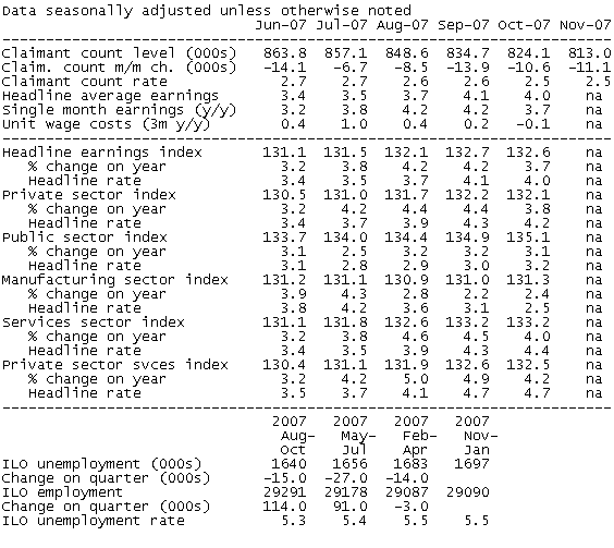 Согласно опубликованному сегодня службой национальной статистики Великобритании отчету по рынку труда, число безработных, подавших заявки на получение по безработице, в ноябре сократилось на 11 100 по сравнению с предыдущим месяцем, превзойдя ожидания аналитиков, прогнозировавших снижение лишь на 5 000, при этом доля безработных, получающих безработице, в рабочей силе составила 2.5% по сравнению с прогнозом в 2.6%, достигнув минимума с 1975 года. Тем временем, число безработных, рассчитываемое по методологии ILO, в период с августа по октябрь сократилось на 15 000 кв/кв и уровень безработицы составил 5.3%, оказавшись ниже среднего прогноза в 5.4%. Кроме того, отчет показал, что в октябре средний уровень оплаты труда замедлили темпы роста с 4.1% г/г до 4.0% г/г, что оказалось ниже прогноза в +4.2% г/г. Доходы служащих государственного сектора в октябре выросли до 3.2% с 3.0% в сентябре, а рост доходов в частном секторе замедлился с 4.3% до 4.2%. Служба национальной статистики Великобритании также сообщила, что пересмотрела данные по изменению числа безработных, получающих пособие по безработице, до 10 600. Уровень занятости ILO, между тем, в период с августа по октябрь вырос на 114 000 человек до 29 291 00, продемонстрировав наибольший рост с лета 2006 года. ProFinance.Ru - Forex News / Новости Форекс