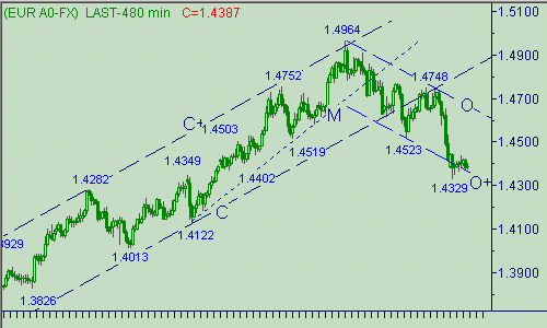 Оставляем вчерашний торговый план и будем пытаться открывать позицию на продажу от области 1.4320/1.4290. В случае теста парой уровня 1.4310 откроем позицию на покупку со стоп-лоссом на 1.4277, цель - 1.4780. Если после открытия позиции евро/доллар поднимется до отметки 1.4340, то закроем половину позиции, а стоп-лосс опустим на 1.4233.