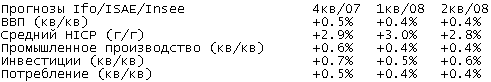 Совместный прогноз трех институтов - немецкого исследовательского института IFO, итальянского ISAE и французского национального статистического института Insee - показал, что рост экономики Еврозоны в четвертом квартале 2007 года и в первом и втором квартале этого года будет слабее, учитывая, что "перспективы роста ухудшились в виду менее благоприятной среды - сохраняющейся напряженности на финансовых рынках и возросшей инфляции". В институтах также ожидают более высоких показателей HICP - 3.0% в первом квартале и 2.8% во втором, при этом данный прогноз основывается на предположении, что курс евро/доллара составит порядка $1.45, а цены на нефть стабилизируются в диапазоне $90/95 за баррель. Базовая инфляция, между тем, как ожидается, снизится до 1.7% в первом полугодии 2008, однако, "в то время как перспективы более слабого роста экономики и недавнее снижение загрузки производственных мощностей поможет снизить базовую инфляцию, рост цен производителей на потребительские товары и косвенные эффекты возросших цен на нефть, вероятно, создадут давление на базовые цены". ProFinance.Ru - Forex News / Новости Форекс