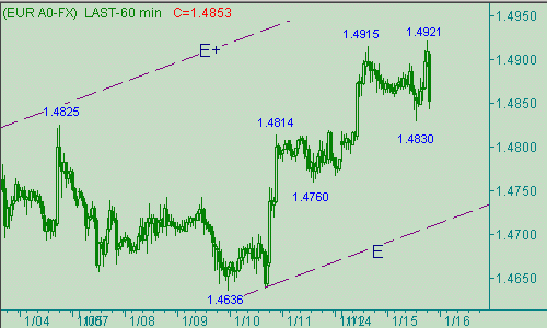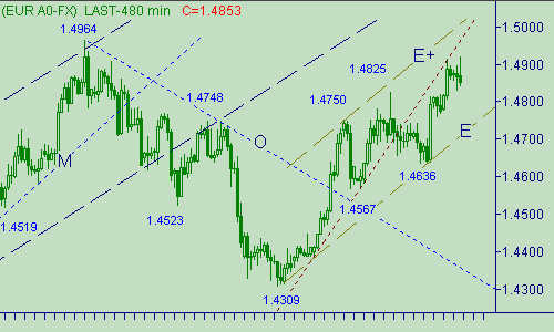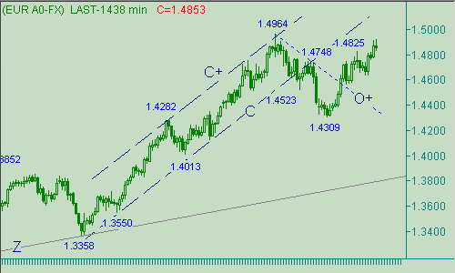 Очередная драчка "быков" и "медведей" вблизи уровня 1.4915, завершилась установлением первыми своего флага на вершине графика с отметкой 1.4921. Но локальную победу все же должны праздновать вторые, так как они смогли вернуть обменный курс ниже уровня 1.4900. Для "мишек" важно, чтобы значения котировок упали ниже 1.4768. ещё лучше - ниже 1.4706 (линия E на рис. 2). А пока мы не видим на графиках никаких серьезных изменений, по-прежнему остается актуальной модель коррекционного изменения курса с нисходящей направленностью от его роста в канале C-C+, в которой снижение евро вдоль линии O на рис. 2 и 3 является первой частью коррекции, а восходящее движение в канале E-E+ на рис. 1 и 2 - второй частью. Прорыв цены выше фигуры 1.5000 заставит нас искать новую рабочую модель, а её падение ниже 1.4635 - подтвердит актуальность выбранной модели.