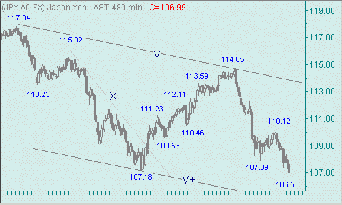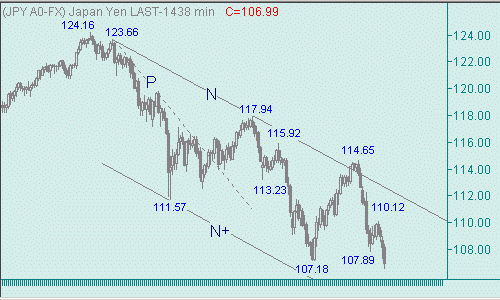 И снова "медведи" продолжают праздновать в трактире с названием "Канал N-N+ на рис. 3" снижение доллар/иены, когда сегодняшний промежуточный дневной минимум равен 106.58. "Быкам" для своей реабилитации необходим прорыв доллара выше фигуры 118.00. Однако даже этот прорыв не нанесет значительного ущерба для шестимесячного падение пары между линиями N и N+. У "косолапых" большой технический задел. Наша оценка текущей ситуации остается прежней: продолжается нисходящее движение доллар/иены с началом от 114.65(27/12/07). На сегодня техническую цель для этого снижения двух валют переносим в область 105.80/70.
