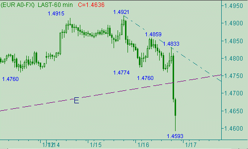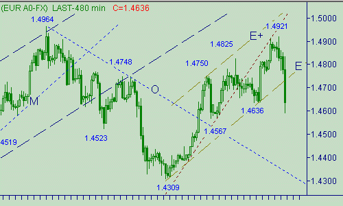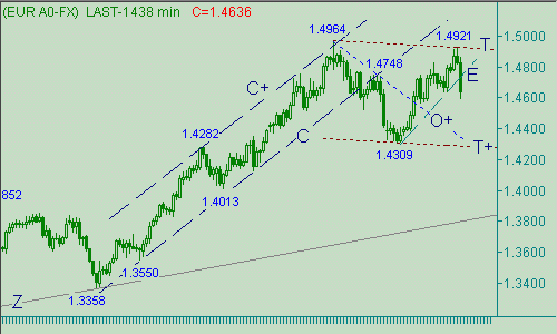 Они приближались и приближались друг к другу, евро/доллар опускался, а линия Е на 1 и 2 поднималась. И вот случилось неизбежное, когда евро упал ниже этой линии. И теперь пара смогла пройти ниже, уже бывшей и важной, области поддержки, находившейся на уровне 1.4636. Этот прорыв указывает нам на то, что завершилось восходящее движение цены вдоль линии E, а следовательно, у "медведей" появляется шанс на формирование третьей части коррекционной формации от восходящего движения двух валют в канале C-C+ на рис. 1. В этой модели восходящее движение евро/доллара 1.4309(120/12/07)-1.4921(15/01/08) является второй частью. Потенциал третьей части, в случае её дальнейшего развития распространяется до фигуры 1.4300. Упомянутая коррекционная формация на рис. 3 обозначена каналом T-T+. Отметим, что сегодняшний промежуточный дневной минимум цены, равный 1.4593, находится как раз в середине этого канала.