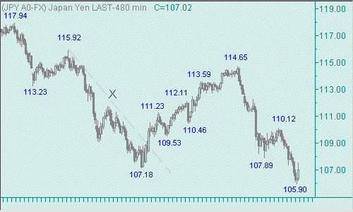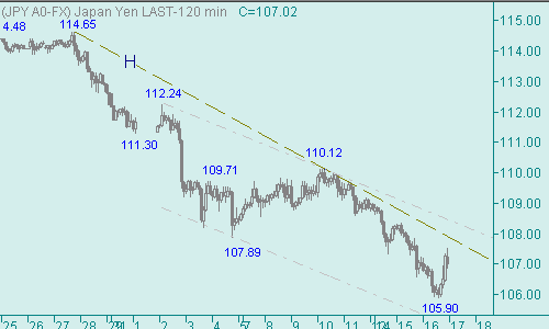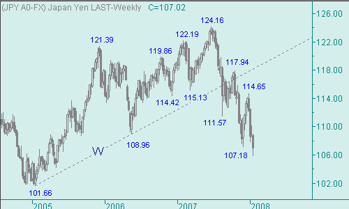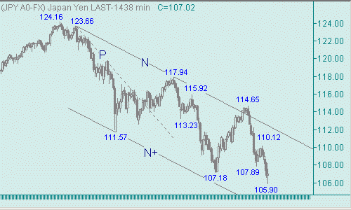 На радость "медведям" доллар/иена опустилась до фигуры 116.00, установив сегодняшний промежуточный минимум, равный 115.90. Вследствие чего обозначилась перспектива завершения нисходящего движения курса вдоль линии H на рис. 1, которое является третьей веткой, направленной вниз, в канале N-N+ на рис. 3. Не знаю как у Вас, а у нас линия H сегодня проходит вблизи уровня 107.87, когда сегодняшний восходящий отскок доллара от 105.90 остановился около отметки 107.52. Текущую ситуацию определяем как процесс формирование ценой коррекции от её падения 108.36(15/01/08)-105.90(16/01/08), с перспективой плавного перехода этой коррекционной формации также в коррекцию, но уже от снижения пары вдоль линии H. В свою очередь, завершенность падения котировок вдоль линии H, может убедить участников рынка в окончание нисходящего тренда в канале N-N+ на рис. 3. На сегодня важным уровнем сопротивления является уровень 108.36, так как прорыв американской валюты выше него будет первым техническим сигналом, который укажет на возможность рассмотренного выше коррекционного сценария.