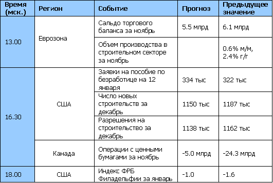 В США сегодня будут опубликованы еженедельные данные по изменению количества заявок на пособие по безработице за предыдущую неделю (16.30 мск.). В это же время выйдут данные по количеству новых строительств и разрешениям на строительство за декабрь, а в 18.00 мск. ФРБ Филадельфии опубликует отчет по индексу деловой активности за январь. Выступления официальных лиц начнутся в 16.15 мск., когда президент ФРБ Кливленда Сандра Пьяналто поделится комментариями по поводу экономических перспектив. В 20.30 мск. президент ФРБ Далласа Ричард Фишер выступит на тему протекционизма, а в 21.15 мск. президент ФРБ Атланты Деннис Локхарт примет участие в экономической конференции Университета Алабамы. Но основное внимание рынков сегодня, пожалуй, привлечет доклад председателя ФРС Бена Бернанке Бюджетному комитету Палаты представителей (18.00 мск.). На этой неделе Бернанке сказал членам Конгресса, что готов поддержать меры для стимулирования экономики. ProFinance.Ru - Forex News / Новости Форекс