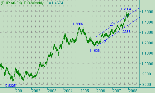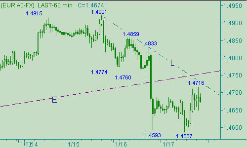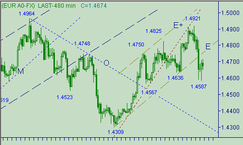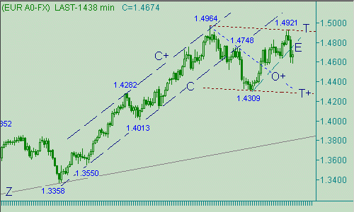 Ситуация не изменилась, после вчерашнего падения курса евро/доллара ниже фигуры 1.4700 он изменяется между 1.4600 и 1.4700, демонстрируя локальные прорывы границ этого диапазона (сегодняшние промежуточные минимум и максимум, соответственно, равны 1.4587 и 1.4716). На текущий момент в качестве важной области сопротивления рассматриваем область, расположенную между 1.47445/60. А в качестве "медвежьего" сигнала будем считать закрытие торгового дня ниже 1.4600. Рабочей моделью остается модель формирования парой коррекционной формации от её роста в канале C-C+ на рис. 3, которая на рис. 3 обозначена каналом T-T+. Согласно этой модели снижение евро вдоль линии L на рис. 1 является третьей частью рассматриваемой коррекции.