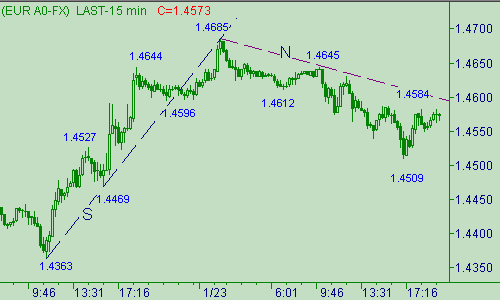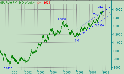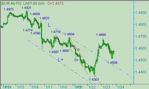 Во время вчерашнего взлета евро/доллар ограничился тестом отметки 1.4684, после чего пара опустилась до 1.4509. Что мы имеем на текущий момент? Курс не поднимался выше 1.4716 (начало последней нисходящей ветки в канале L-L+ на рис. 2), а, следовательно, сохраняется возможность дальнейшего падения цены с началом от 1.4921(14/01/08), которое в выбранной нами коррекционной модели является третьей частью этой ценовой формации. С другой стороны, в результате вчерашнего роста котировок (1.4363-1.4683) на ценовом графике сформировался очень симпатичный восходящий импульс, который может стать первым восходящим движением двух валют в новом "бычьем" тренде, потенциал которого распространяется до 1.5000. Поэтому текущую ситуацию считаем неопределенной, когда "медведям" необходим прорыв евро/доллара ниже 1.4500 с последующей атакой на 1.4340, успех в которой позволит им расширить нисходящее движение с началом от 1.4921(14/01/08) до 1.4260/70, а их противникам - подъем евро выше 1.4710, что укажет на их стремление протестировать уровень 1.4830. При этом подъем цены выше последнего уровня откроет ей путь к 1.5000. На сегодняшний день перечисленные выше уровня и области можно пробовать использовать для открытия новых позиций.