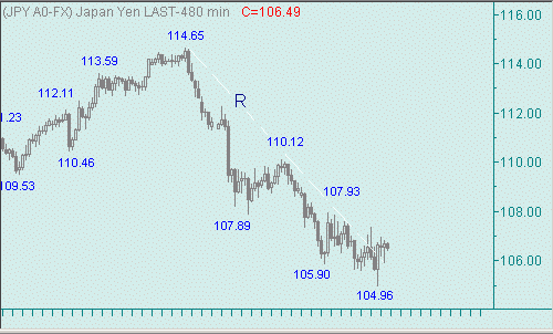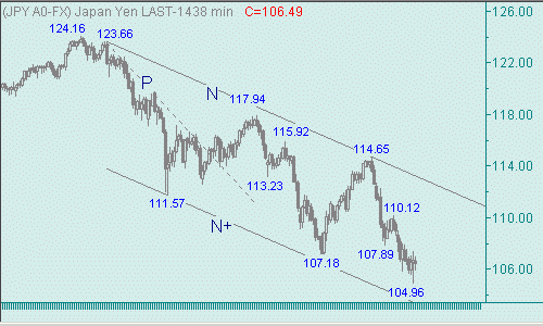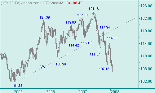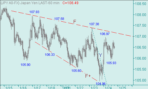 Техническую ситуацию на графиках доллар/иены рассматриваем как неопределенную. С одной стороны на рис. 1 можно видеть, что пара смогла подняться выше линии R, и она продолжает формировать последовательности нисходящих вершин и донышек, в совокупности образующих расходящийся клин (на рис. 1 - область между линиями F и F+), ценовая структура которого предполагает возможность окончания снижения доллара вдоль линии R. А с другой стороны, "предполагает", но не "означает". Вблизи вчерашнего минимума, равного 104.96, находится уровень Фибоначчи 76.4% от движения 114.65(27/12/07)-107.89(4/01/08) отложенного от 110.12 (10/01/08). Это локальное донышко ограничивает нисходящее движение от максимума прошлого года (124.16(22/06/07)). Но немного ниже, расположены более симпатичные уровни поддержки, вблизи которых может завершиться это нисходящее движение. Например, области 104.40/30, 103.95/85 и 103.40/30.