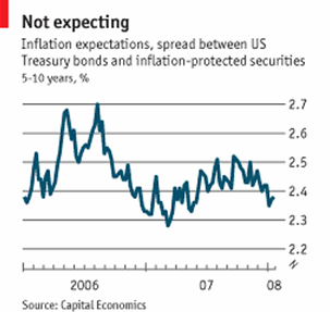 Так что, не пора ли оставить наши опасения относительно инфляции? Не совсем. Во-первых, скачок структурной инфляции предполагает, что ценовое давление просочилось за пределы сырьевого рынка. Согласно базовому индексу потребительских цен Goldman, который исключает волатильные категории продуктов питания и топлива, они растут примерно в 70% стран. Во-вторых, экономическая слабость не сразу начинает нейтрализовывать ценовое давление. Экономисты Goldman указывают на то, что в период мирового экономического спада в 2000-02гг., структурная инфляция в странах Большой Семерки пребывала на пиковом уровне еще в течение года после начала ослабления экономики. Богатый мир может легко столкнуться проблемой слабого роста на фоне ценового давления. Степень беспокойства в данном случае, зависит от того, влияет ли эта комбинация на инфляционные ожидания людей. Научные факты свидетельствуют о том, что низкие инфляционные ожидания - это главное различие между ситуацией 1970-х и тем, что мы имеем сейчас. Так как Центробанки заработали репутацию борцов с инфляцией, и люди ожидают, что долгосрочная инфляция останется низкой, ценовые потрясения - даже в масштабе недавнего роста стоимости сырья - не должны перейти в устойчивую высокую инфляцию. Если бы работники и фирмы ожидали повышения инфляции, и соответствующим образом устанавливали бы уровень зарплат и цен, центральные банки столкнулись бы с большой проблемой. Это тревожное состояние не дает покоя Европейскому центральному банку (ЕЦБ). Исходя из проведенного им исследования, в экономике сохраняются стабильные ожидания высокой инфляции: аналитики считают, что в течение 5 ближайших лет она не опустится ниже 1,9%. Однако потребительские ожидания роста цен в следующем году довольно резко увеличиваются. Более того, уровень безработицы невысок, и судя, по начальному предложению профсоюзов в рамках переговоров об увеличении заработной платы, начиная с Германии и заканчивая Италией, рабочие требуют изрядного повышения оплаты труда. Не исключается вероятность образования инфляционной спирали заработной платы и цен. Жесткий настрой ЕЦБ - включая угрозы возможного повышения процентных ставок - направлен на разрешение ситуации. Политика ФРС не так агрессивна, хотя в Америке инфляция растет быстрее, чем в Еврозоне. Судя по спрэду между американскими казначейскими облигациями и государственными ценными бумагами, инфляционные ожидания инвесторов на ближайшие 5-10 лет падают. Недавнее решение ФРС ускорить темпы снижения процентных ставок вполне понятно. Слабая экономика более опасна, чем инфляция. Однако есть риск. Даже в случае снижения инфляции цен на сырье, падение доллара указывает на то, что Америке грозят другие опасности. Если общее ценовое давление упрямо будет сохранять свои высокие позиции, инфляционные ожидания могут вырасти. Если это произойдет, перед ФРС встанет незавидная задача ограничивать свою политику послабления или даже повышать ставки, несмотря на ослабленное состояние экономики.