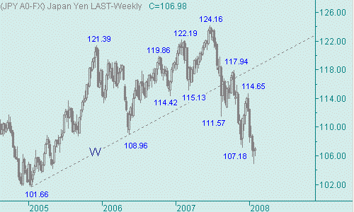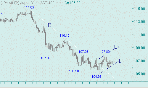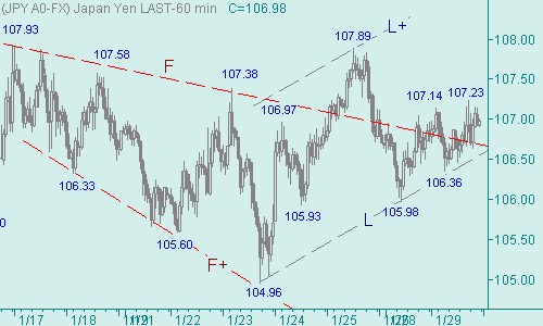 Доллар/иена ничем серьезным нас не удивила, и второй день пара размеренно двигается вдоль линии L на рис. 1. Проблемой "медведей" становится временной параметр, когда совсем скоро станет не актуальной модель коррекции цены от её снижения в расходящимся треугольнике F-F+ на рис. 1. А тогда восходящее движение 104.96(23/01/08)-107.89(25/01/08), которое мы ранее рассматривали как первую часть указанной коррекции, можно будет считать первым "бычьим" импульсом в восходящем тренде, обозначенным на рис. 1 и 2 каналом L-L+. Расширение этого подъема цены будет предполагать возможность формирования модели коррекции доллар/иены от её падения 114.65(27/12/07)-104.96(23/01/08). Но пока паре необходимо пробиться выше фигуры 118.00. Так же как для продолжения нисходящего канала N-N+ потребуется убедительный проход цены ниже 105.00.