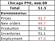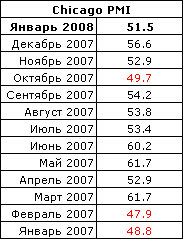Индекс деловой активности Ассоциации Менеджеров в Чикаго в январе составил 51.5 пункта. Фактический результат оказался выше 50 пунктов, что свидетельствует о незначительном росте экономической активности. Но очень негативным фактором является существенное снижение показателя по сравнению с предыдущим месяцем, так как в декабре Chicago PMI Index составлял 56.4 пункта. Изучение компонентов индекса позволяет более детально понять, насколько негативной выглядит ситуация. Значение компонента цен на производимую продукцию оказалось очень высоким - 81.7 пункта. Это самое высокое значение компонента с июля 2006 года. Компонент новых заказов составил 44.7 пункт - самое низкое значение с апреля 2003 года. Значение более чем на 5 пунктов ниже 50, что говорит о существенном снижении количества новых заказов. Производственный компонент и компонент запасов на складах оказались равными 51.3 пункта и 51.1 пункта соответственно. Однако перспективы этих показателей в горизонте предстоящих месяцев могут оказаться незавидными в связи с тем, что новые заказы снижаются слишком быстро. Огорчил и компонент занятости, который оказался ниже 50-пунктового значения и составил 47 пунктов. Это говорит о том, что занятость в производственном секторе в январе не просто не росла, она снижалась. Неприятная информация, особенно в контексте ожиданий отчета по рынку труда за январь, который будет опубликован в пятницу.