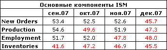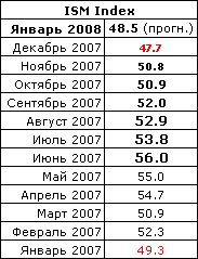 ISM. В декабре индекс ISM составил 47.7 пункта. Как известно, значение показателя ниже 50 пунктов говорит о замедлении деловой активности. Согласно среднему прогнозу, составленному по результатам опроса агентства Reuters, в январе значение индекса должно составить 47.8 пункта. Ценность индекса ISM заключается в том, что он является одним из самых точных показателей опережающего характера. Мы всегда внимательно изучаем индекс и его компоненты, желая получить ответы на вопросы о здоровье американской экономики. Именно индекс ISM еще в мае 2006 года заставил нас публично высказать беспокойства о назревающей рецессии в американской экономике. Значение индекса ISM демонстрирует нисходящую динамику в течение 7 месяцев подряд. В декабре показатель упал ниже ключевого значения в 50 пунктов, и мы не видим причин, которые позволили бы говорить о том, что с тех пор производственная активность значительно улучшилась. Четыре ключевых компонента индекса: новые заказы, производственный индекс, индекс занятости и запасов - все в декабре имели значения ниже 50 пунктов. Мы прогнозируем значение январского индекса ISM в диапазоне от 48 до 46 пунктов. Сегодняшний Chicago PMI Index сыграл немаловажную роль в столь пессимистичном прогнозе. При этом менее значимые индексы деловой активности менеджеров по поставкам в Милуоки, Цинциннати и Нью-Йорке также оказались слабыми в январе. Поэтому, не смотря на то, что декабрьское значение общенационального индекса ISM оказалось минимальным почти за последние 5 лет, мы ожидаем его дальнейшего ослабления.