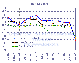 Американский макроэкономический календарь во вторник не был богат на события. В списке ключевых отчетов был представлен лишь индекс деловой активности ISM в секторе услуг, который, к слову говоря, оказался крайне удручающим и по уровню пессимизма должен был превысить негатив данных об активности в непроизводственной сферы еврозоны. Общий индекс активности в непроизводственной сфере США составил в январе 44.6 пункта, что однозначно указывает на спад в секторе услуг. Однако ключевые компоненты индекса еще сильнее были наполнены пессимизмом. Индекс деловой активности в секторе услуг упал с 54.4 пункта в декабре до 41.9 пункта в январе. Это первое падение компонента ниже 50 пунктов с марта 2003 года. И такое фактическое значение говорит о очень существенном спаде деловой активности в этом секторе. Индекс новых заказов оказался не менее драматичным. Этот компонент упал на 10.4 пункта с 53.9 в декабре до 43.5 в январе. Это также первое значение ниже 50 пукнтов с марта 2003 года. Январское значение компонента говорит о снижении новых заказов в будущем. Компонент занятости в январе упал до значения в 43.5 пункта. Последний раз компонент оказывался ниже 50-пунктового значения в августе прошлого года. Из 12 отраслей непроизводственной сферы лишь одна рапортовала об увеличении занятости.