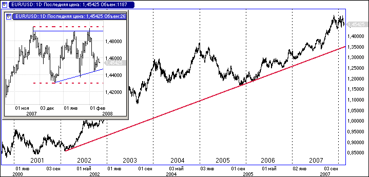 Последние 3.5 месяца курс валютной пары евро/доллар пребывает в рамках диапазона 1.49/1.43. Вопрос развития динамики курса в настоящий момент волнует превалирующее большинство рыночных участников. Это не удивительно, поскольку естественным образом можно предположить, что пробитие той или иной границы диапазона будет носить судьбоносный характер для среднесрочных перспектив. В настоящий момент мы предпочли не концентрироваться на поиске фактора или события, который способен выступить в роли драйвера, разрушающего диапазонную торговлю. Мы задумались над тем, что стало причиной возникновения диапазона, который, немаловажно отметить, венчает многолетний тренд ослабления доллара против евро.