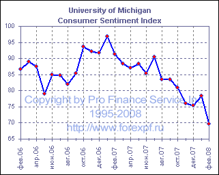 Индекс потребительских настроений Reuters/Мичиганского университета в феврале оказался заметно хуже ожиданий аналитиков, прогнозировавших его снижение до 76 пунктов, и по предварительным данным составил 69.6 пункта после 78.4 в январе. Согласно отчету, в феврале индекс текущих условий упал до 85.4 с 94.4 в предыдущем месяце, а индекс ожиданий составил 59.4 пункта после 68.1 ранее. Однолетние инфляционные ожидания, между тем, возросли с 3.7% против 3.4% ранее, в то время как пятилетние инфляционные ожидания остались на прежнем уровне в 3.0%. ProFinance.Ru - Forex News / Новости Форекс