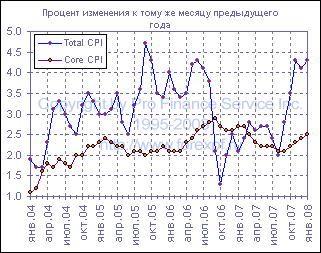 Как показал отчет Бюро трудовой статистики США, индекс цен потребителей в январе вырос на 0.4% м/м до 4.3% г/г (максимум с сентября 2005), что оказалось выше среднего прогноза экономистов, опрошенных Reuters, в +0.3% м/м до 4.2% г/г. Между тем, базовый показатель инфляции (прим. ProFinance.ru: без учета энергоносителей и продуктов питания) также превзошел прогнозы в +0.2% м/м и 2.4% г/г и в январе вырос на 0.3% м/м до 2.5% г/г. Рост инфляции был, в частности, подержан ростом цен на одежду на 0.4%, более высокими ценами на авиабилеты (+0.8%), медикаменты (+0.7%), табак (+1.1%) и услуги отелей (+1.1%). Цены на продукты питания выросли на 0.7%, энергоносители подорожали на 0.7%, а цены на транспорт поднялись на 0.5%. ProFinance.Ru - Forex News / Новости Форекс