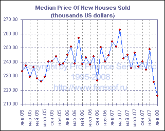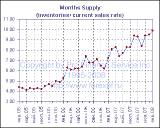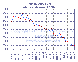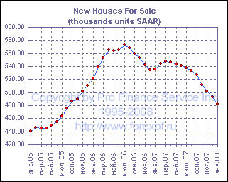 Как показал опубликованный сегодня отчет, коррекция на рынке жилья не демонстрирует признаков завершения, и в январе продажи новых домов упали на 2.8% до 588 000, что оказалось хуже среднего прогноза аналитиков в 600 000 и минимальным значением с февраля 1995 года, когда продажи составили лишь 559 000. Между тем, число новых домов выставленных на продажу в январе несколько сократилось и составило 482 000 после 493 000 в декабре, однако, учитывая нынешние темпы продаж, показатель запасы/продажи продолжил расти и в январе составил 9.9 месяцев после 9.5 месяцем ранее. Рост продаж в январе был зафиксирован на западе США, где он составил 2.2%, однако в остальных регионах наблюдалось падение, в частности на северо-востоке оно составило 10.3%, на среднем западе - 7.6%, а на юге - 2.4%. Средняя цена дома, тем временем, продолжила падать и в январе снизилась на 4.3% м/м или 15.1% г/г до $216 000. ProFinance.Ru - Forex News / Новости Форекс