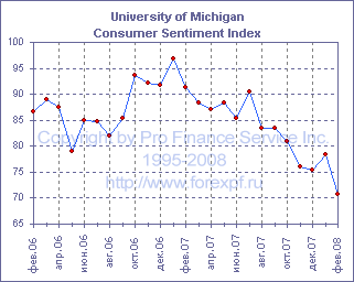 Доверие американских потребителей в феврале продолжило падение, однако его темпы оказались чуть менее агрессивны, чем предполагал предварительный отчет Reuters и Мичиганского университета. Индекс потребительского доверия в окончательном варианте составил 70.8 пункта, что оказалось немного лучше среднего прогноза экономистов, ожидавших 69.6 пункта после 78.4 в январе. Улучшение по сравнению с первоначальным отчетом наблюдалось в части индекса ожиданий, который составил 62.4 пункта после 68.1 в январе (предыдущая оценка 59.4). Индекс текущих условий, тем временем, был пересмотрен в меньшую сторону с 85.4 до 83.8, тогда как месяцем ранее составлял 94.4 пункта. Индекс однолетних инфляционных ожиданий был пересмотрен с 3.7% до 3.6% (прим.ProFinance.ru: в январе он составлял 3.4%), а индекс пятилетних инфляционных ожиданий оставлен на прежнем уровне в 3.0%. ProFinance.Ru - Forex News / Новости Форекс