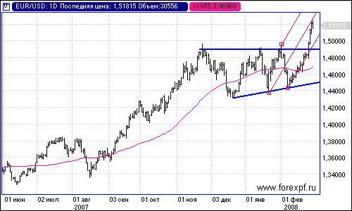 В текущих условиях, когда сработала фигура классического технического анализа и долгосрочная тенденция получила продолжение, мы бы не советовали искать возможность продаж. В прошлый вторник курс евро/доллар пробил верхнюю границу консолидационного диапазона, который был сформирован в виде сходящегося треугольника. Таким образом, этот треугольник выполнил роль фигуры продолжения тенденции, и совершенное к настоящему моменту движение не отыграло весь потенциал, который в текущих условиях предполагает достижение области 1.5350/1.5400. Михаил Шульгин ProFinance.Ru - Forex News / Новости Форекс