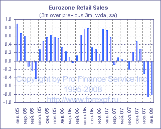 Розничные продажи в Еврозоне в январе вросли на 0.4% по сравнению с предыдущим месяцем, в результате чего в годовом исчислении снижение составило -0.1% по сравнению с -1.8% в декабре (прим. ProFinance.ru: показатель был пересмотрен с -2.0%), однако показатель все же оказался хуже среднего прогноза аналитиков, рассчитывавших на более сильное восстановление в +0.6% м/м до +0.2% г/г. Трехмесячная скользящая темпа роста продаж в январе составила -0.1% по сравнению с -0.4% в декабре, в то время как продажи в период с ноября по январь упали на 0.8% по сравнению с предыдущими тремя месяцами, что оказалось чуть лучше, чем -0.9%, зафиксированные в декабре. Рост продаж в январе был зафиксирован в части продаж продуктов питания, напитков и табака (+0.6% м/м), которые снижались на протяжении последних трех месяцев, тогда как продажи непищевой продукции возросли на 0.4% после 0.0% в декабре и -0.4% в декабре. Продажи выросли в Германии (+1.6%), Бельгии (+9.5%), Португалии (+4.1%), Австрии (+1.4%), Люксембурге (+0.7%) и Финляндии (+0.7%), тогда как падение было отмечено в Испании (-1.1%). ProFinance.Ru - Forex News / Новости Форекс