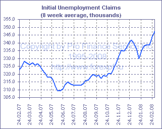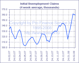 Число новых заявок на получение пособий по безработице, согласно отчету, департаменту труда США, в неделю до 1 марта сократилось на 24 000 до 351 000, что оказалось несколько лучше прогнозов аналитиков, ожидавших снижения до 360 000. Между тем, данные за предыдущую неделю были пересмотрены с 373 000 до 375 000, в результате чего среднее за четыре недели число новых заявок сократилось на 1 500 до 359 500. Тем временем, общее число лиц, получающих пособие по безработице (прим. ProFinance.ru: continuing claims), продолжило расти и в неделю до 23 февраля достигло 2.831 млн., поднявшись на 29 000 с 2.802 млн. неделей ранее, что является максимальным уровнем с 24 сентября 2005 года. Несмотря на некоторое снижение числа новых заявок, общее впечатление от отчета остается негативным, учитывая сохраняющуюся тенденцию к росту четырехнедельных значений как новых заявок, так и числа тех, по которым продолжают выплачиваться пособия по безработице. Экономисты HFE, между тем, также рекомендуют обратить внимание на то, что менее волатильный показатель - среднее число заявок за восемь недель - также сохраняет тенденцию к росту. ProFinance.Ru - Forex News / Новости Форекс