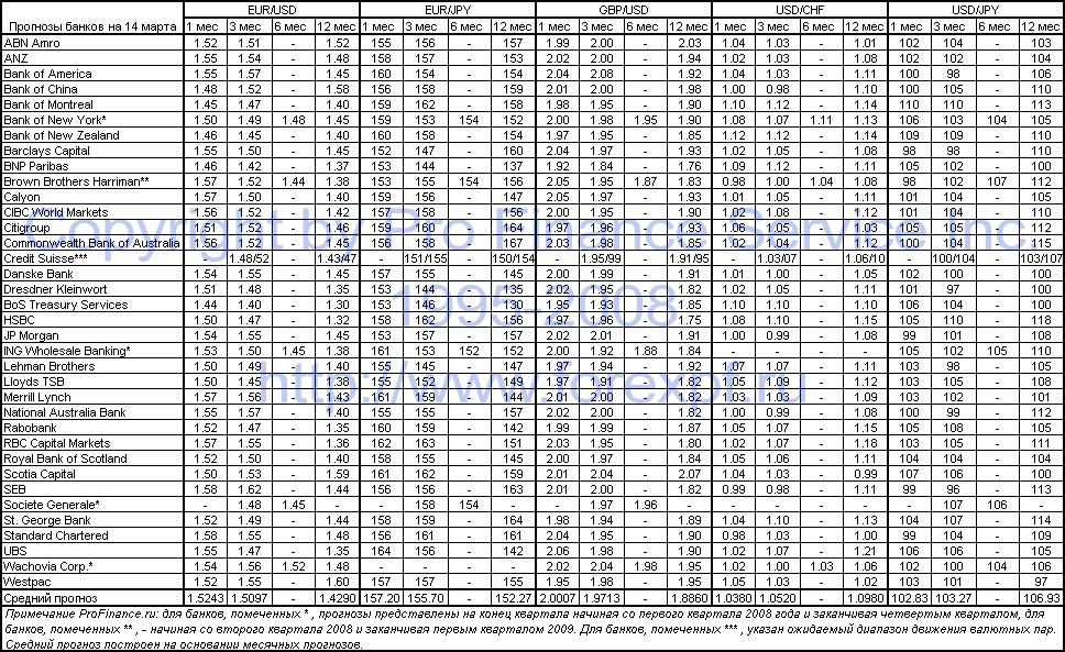 Мы обновили сводную таблицу прогнозов от крупнейших банков мира. В таблице, которая представлена ниже, все прогнозы остаются актуальными по состоянию на 14 марта 2008 года. Как и прежде мы будем регулярно публиковать сводные данные не реже одного раза в месяц, с учетом возможных пересмотров прогнозов к моменту каждой новой публикации сводной таблицы. Мы сохраняем за собой единоличное право в составлении списка финансовых институтов, включенных в сводную таблицу. Мы будем стараться отдавать приоритет таким банкам и инвестиционным домам, репутация, профессионализм и экспертный уровень которых не вызывают сомнений в мировом финансовом сообществе. Дмитрий Храбров ProFinance.Ru - Forex News / Новости Форекс