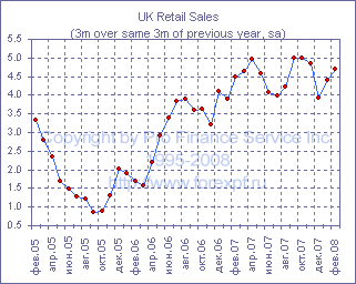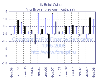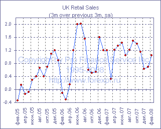 Данные по розничным продажам, опубликованные сегодня национальным статистическим агентством Великобритании, приятно удивили быков по фунту, учитывая, что в феврале рост продаж составил 1.0% м/м, в результате чего годовые темпы роста достигли 5.5% г/г, что оказалось заметно лучше ожиданий аналитиков, прогнозировавших сокращение темпов роста продаж на 0.2% м/м до 3.6% г/г. Между тем, темпы роста за январь были пересмотрены в большую сторону и составили 1.1% по сравнению с предыдущей оценкой в 0.8%. Рост продаж в непродуктовых магазинах составил 0.5% м/м, в то время как продажи продуктов питания выросли на 1.6% м/м, что стало максимальным ростом с июня 2006 года. Продажи в магазинах текстиля, обуви и одежды выросли на 2.5% м/м, внемагазинные розничные продажи, тем временем, выросли на 1.7% м/м, в то время как продажи в остальных магазинах выросли на 1.6% м/м. Единственные отрицательные результаты в феврале были зафиксированы в части продаж хозяйственных товаров, которые упали на 4.2% м/м. Тем временем, темпы роста продаж в период с декабря по февраль составили 1.0%, поднявшись по сравнению с +0.7% в предыдущем месяце и +0.6% в декабре, а темпы роста в этот период по сравнению с аналогичным периодом годом ранее достигли 4.4% после 4.4% в январе и 3.9% в декабре. ProFinance.Ru - Forex News / Новости Форекс