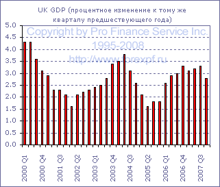 Темпы роста ВВП Великобритании в четвертом квартале после пересмотра в окончательном варианте составили 0.6% кв/кв или 2.8% г/г, в то время как аналитики ожидали их сохранения на прежнем уровне в 0.6% кв/кв до 2.9% г/г, в результате чего в целом за 2007 год рост экономики составил не 3.1%, а 3.0%. По данным Национальной статистической службы Великобритании, рост производства в производящих отраслях составил 0.2%кв/кв после -0.3% кв/кв в предыдущем квартале, при этом в секторе обрабатывающей промышленность темпы роста были нулевыми. Рост в секторе услуг составил 0.7% кв/кв, однако замедлился по сранению с 0.9% кв/кв в предыдущем квартале, что было связано с более слабыми розничными продажами и замедлением в секторе деловых и финансовых услуг, темп роста в котором замедлился до 0.6% кв/кв после 1.4% кв/кв ранее. В строительном секторе, тем временем, темпы роста составили 1.1% кв/кв после 0.4% кв/кв в предыдущем квартале. Валовые внутренние расходы в четвертом квартале выросли на 0.4% кв/кв, замедлившись по сравнению с +1.5% кв/кв в предыдущем квартале. Потребительские расходы выросли на 0.1% кв/кв до 2.4% г/г, тогда как ранее предполагался рост на 0.2% кв/кв, при этом расходы на товары выросли на 0.3% кв/кв, а на услуги - на 0.4% кв/кв. Государственные расходы, между тем, сократились на 0.5% кв/кв до +1.3% г/г. Валовые капитальные вложения выросли на 1.8% кв/кв до +4.1% г/г, при этом рост деловых инвестиций составил 1.8% кв/кв, а государственные инвестиции выросли на 7.2% кв/кв. Уровень запасов вырос на stg2.9 млрд. Дефицит торгового баланса сократился до stg 11.6 млрд. со stg12.2 млрд., при этом экспорт сократился на 0.5% кв/кв (+0.6% г/г), в то время как импорт снизился на 1.0% кв/кв (+3.1% г/г). Уровень сбережений, согласно отчету, составил 3.3% после 2.6% в третьем квартале и в целом за 2007 год он составил 2.9%, что является минимальным значением с 1959 года. ProFinance.Ru - Forex News / Новости Форекс
