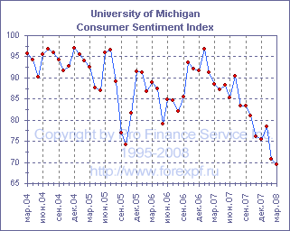 Индекс потребительских настроений, рассчитываемый Reuters и Мичиганским университетом, в марте в окончательном варианте соствил 69.5 пункта, что оказалось на 1 пункт ниже предварительных 70.5 пунктов и на 0.5 пункта ниже среднего прогноза аналитиков, ожидавших снижения до 70.0 пунктов. Индекс текущих условий был пересмотрен с 84.6 до 84.2, в то время как в феврале он составил 83.8 пункта, тогда как индекс ожиданий был пересмотрен с 61.4 до 60.1 пункта, тогда как ранее индекс составлял 62.4 пункта. Индекс однолетних инфляционных ожиданий, согласно отчету, был пересмотрен с 4.5% до 4.3%, а индекс пятилетних инфляционных ожиданий остался на прежнем уровне в 2.9% (прим. ProFinance.ru: в февале значения индексов составляли 3.6% и 3.0% соответсвенно). ProFinance.Ru - Forex News / Новости Форекс