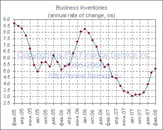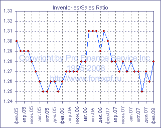 Отчет Департамента торговли США, опубликованный сегодня, указал на то, что в феврале товарно-материальные запасы продемонстрировали рост на 0.6% м/м до $1468.4 млрд., что соответствовало среднему прогнозу экономистов, при этом в годовом исчислении темпы роста составили 5.2%. Продажи, тем временем, в этот же период сократились на 1.1% м/м до $1142.8 млрд., в результате чего годовые темпы роста достигли 6.7%, а коэффициент запасы/продажи обозначил максимальный уровень с августа 2007 года и составил 1.28 после 1.26 в январе. Источник: ProFinance.Ru - Новости рынка Форекс