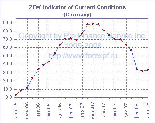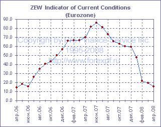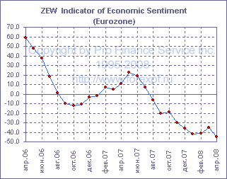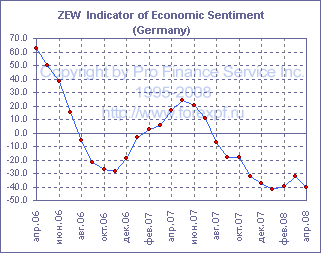 Характер опубликованного сегодня отчета ZEW был кардинально противоположным тому, чего ждали многие участники рынка, учитывая, что в апреле индекс экономических ожиданий в Германии рухнул на 8.7 пункта до -40.7, что резко контрастировало со средним прогнозом аналитиков, предполагавшим дальнейшее восстановление показателя до -28.0 пункта. Между тем, индекс текущих условий все же поднялся немного выше после 32.1 пункта в марте и составил 33.2 пункта, что, однако, также оказалось хуже среднего прогноза в +34.0 пункта. Согласно отчету, влияние на ожидания оказали необыкновенно сильные ценовые давления в Германии, зафиксированные в этом месяце. Более высокая инфляция негативно сказалась на располагаемом доходе потребителей и их расходах, а меньшее число поступающих заказов немецким компаниям также является негативным сигналом. По словам президента ZEW Вольфганга Франца, легкий оптимизм специалистов по финансовым рынкам в прошлом месяце был временным явлением. Новые максимумы евро на фоне высоких цен на нефть вновь оказали негативное влияние на ожидания. Тем не менее, по его мнению, на данный момент место ярко выраженному пессимизму также нет, и рост ВВП Германии на 1.7% в этом году остается реальным. Тем временем, в Еврозоне в целом экономические ожидания также ухудшились и их индекс упал на 9.8 пункта до -44.8 пункта, при этом индекс текущих условий также продемонстрировал ухудшение и составил 15.5 пункта, снизившись на 3.9 пункта после 19.4 в предыдущем месяце. Источник: ProFinance.Ru - Новости рынка Форекс