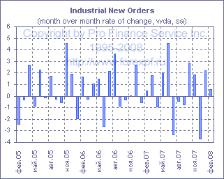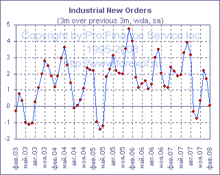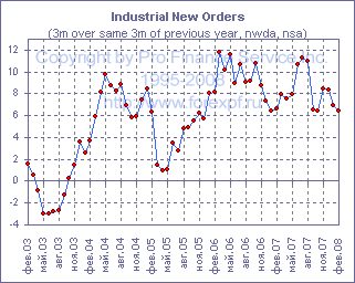 Согласно опубликованному сегодня отчету Eurostat, объем новых промышленных заказов в странах Еврозоны в феврале выросли на 0.6% м/м, в результате чего годовые темпы роста достигли 9.9% г/г, что оказалось заметно лучше среднего прогноза аналитиков, ожидавших роста лишь на 0.1% м/м до +6.8% г/г. Данные за предыдущие месяцы, между тем, были пересмотрены, в частности месячные темпы роста заказов в январе составили 2.2% м/м, а не 2.0% м/м, в то время как за декабрь и ноябрь темпы изменения были пересмотрены с -3.6% м/м до -3.7% м/м и с +2.0% м/м до +1.8% м/м соответственно. В результате, темп изменения показателя в период с декабря по февраль по сравнению с периодом с ноября по январь составил -0.33% после +0.10% в январе, а заказы в январе/феврале по сравнению со средним значением четвертого квартала 2007 года выросли на 0.6%.