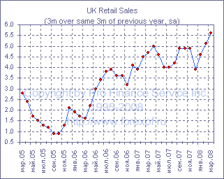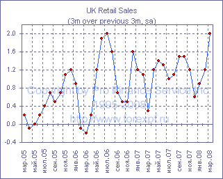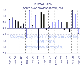 Национальное статистическое агентство Великобритании сегодня сообщило о том, что в марте этого года динамика розничных продаж приняла отрицательный характер, и их объем снизился на 0.4% м/м (прим. ProFinance.ru: максимальное снижение с января 2007 года) по сравнению с февралем, что, однако, в целом соответствовало ожиданиям участников рынка. Между тем, ослабление продаж в марте привело к замедлению годовых темпов роста до 4.6% г/г, что оказалось выше, чем +4.2% г/г, которые прогнозировали аналитики. Между тем данные за предыдущие месяцы подверглись пересмотру, в результате чего темпы роста продаж в феврале составили 1.1% м/м против первоначальных 1.0% м/м, а темпы роста в январе составили 1.5% м/м против первоначальных 1.1% м/м. Снижение продаж в марте было обусловлено падением продаж без учета продуктов питания на 0.7% м/м, а также снижением продаж в неспециализированных магазинах на 2.5% м/м, иных магазинах на 2.1% м/м и падением продаж в магазинах текстиля, обуви и одежды на 1.7% м/м. Тем временем, продажи в период с января по март в сравнении с предыдущими тремя месяцами выросли на 2.0% после 1.2% в феврале и 0.9% в марте, что свидетельствует о том, что, несмотря на ухудшение кредитных условий и потребительского доверия, на рынке продолжает сказываться эффект позитивного заряда прошлых периодов. Источник: ProFinance.Ru - Новости рынка Форекс
