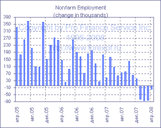 Опубликованный сегодня отчет Департамента труда США преподнес участникам рынка приятный сюрприз, учитывая, что число новых рабочих мест вне сельского хозяйства в апреле сократилось лишь на 20 000, что резко отличалось от среднего прогноза в -70 000 и даже оказалось лучше наиболее оптимистичных ожиданий. Между тем, отчет просигнализировал о сокращении уровня безработных на 0.2% до 5.0%, что также превзошло ожидания аналитиков в 5.2%. Тем не менее, в целом характер данных был довольно негативен, учитывая, что занятость сокращается уже четвертый месяц подряд, при этом данные за предшествующие два месяца были пересмотрены с -80 000 до -81 000 и с -76 000 до -83 000 соответственно, в результате чего за первый квартал число рабочих мест сократилось на 240 000. В разрезе по отраслям, число рабочих мест сократилось на 61 000 в строительном секторе, на 46 000 в обрабатывающей промышленности, а в секторе розничной торговли - на 27 000. Государственные рабочие места, тем временем, выросли на 13 100, в секторе здравоохранения и образовательных услуг рост составил 52 000, а в ресторанном секторе занятость выросла на 18 000. Согласно отчету, рост числа занятых в апреле составил 362 000 до 146.331 млн. после 145.969 млн., при этом число занятых вне с/х составило 137.818 млн. после 137.838 в марте. Число безработных, между тем, сократилось на 189 000 с 7.815 млн. до 7.626 млн. Средний уровень оплаты труда вырос на 0.1% м/м до 3.4% г/г что оказалось несколько ниже +0.3%, которых ожидали участники рынка, а средняя продолжительность рабочей недели составила 107.2 часа после 107.6 ранее. Источник: ProFinance.Ru - Новости рынка Форекс
