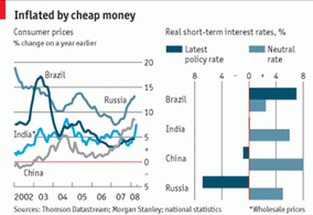 Если развивающиеся экономики отделяются от Америки, монетарные политики тоже должны получить свободуУгроза финансового кризиса и экономической рецессии лишила сна многих политиков от Лондона до Вашингтона. Однако в Пекине, Москве и других столицах развивающегося мира главной печалью остается растущая инфляция. Так, в Поднебесной темпы роста инфляции в этом году подскочили до 8.3%, что на 2.2% выше, чем в начале 2007 года. В России годовая инфляция составляет 13.3% (см. график слева). Согласно прогнозам HSBC, средний уровень инфляции в развивающихся экономиках в этом году составит 6.6% - это самое высокое значение за последние десять лет. Одна из возможных причин кроется в резком удорожании продуктов питания и энергоносителей. В развивающемся мире на покупку продуктов питания уходит большая часть доходов, чем в развитых странах, именно поэтому рост цен на зерновые и мясо сильнее влияет на уровень инфляции в этих странах. Но это лишь часть проблемы: чистая инфляция также ползет вверх, а в этом уже следует винить чрезмерно ослабленную монетарную политику. Американская экономика находится в упадке, а развивающиеся страны, между тем, чувствуют себя очень неплохо. Согласно прогнозам HSBC, средние темпы роста ВВП в развивающихся странах составят 6.5%, что в четыре раза выше среднего показателя по развитым странам. Не исключено, что экономикам удалось вырваться из американской зависимости, а вот монетарным политикам - нет, в этом и заключается главная проблема. Конечно, устойчивость развивающихся экономик, на данный момент, это залог стабильности мировой экономики, вот только зависимость их монетарной политики от развитого мира сильно осложняет дело.