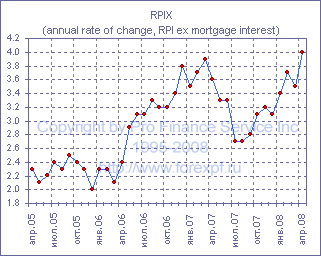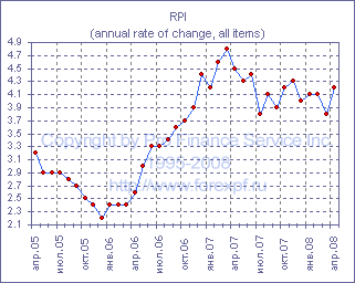 Стимулом к росту RPI, тем временем, стал рост цен на топливо и свет, "прибавивший" к годовым темпам роста индекса 0.16%, а также рост цен на алкогольную продукцию, товары для домохозяйств, продукты питания и услуги для домохозяйств, обеспечившие 0.12%, 0.10%, 0.10% и 0.06% соответственно. Изменение цен на жилье, обувь и одежду, а также на автомобильные расходы и на расходы на проезд, между тем, "вырезали" из роста годового RPI 0.04%, 0.05%, 0.09% и 0.04% соответственно. Источник: ProFinance.Ru - Новости рынка Форекс