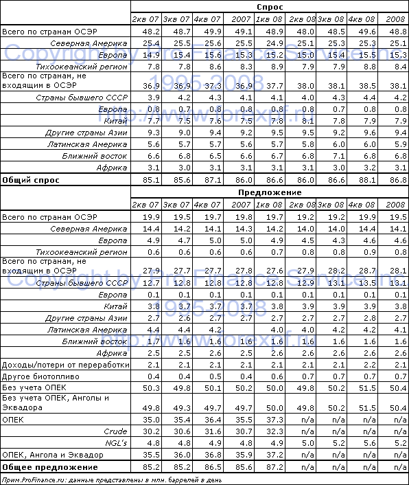 Ниже представлено краткое резюме фактических данных по спросу и предложению на рынке нефти за 2007 год и прогнозов IEA по спросу и предложению на текущий год, данных в мае. Источник: ProFinance.Ru - Новости рынка Форекс