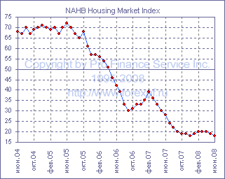 Индекс рынка жилья NAHB в июне неожиданно упал ниже и составил 18 пунктов (прим. ProFinance.ru: рекордный минимум) после 19 пунктов в мае, что оказалось ниже среднего прогноза аналитиков, рассчитывавших на восстановление до 20 пунктов. Согласно отчету, индекс текущих продаж односемейных домов в июне остался на прежнем уровне в 17 пунктов, индекс ожидаемых также не изменился и составил 28 пунктов, а индекс предполагаемых покупателей упал до 17 пунктов после 18 пунктов в мае и 19 в апреле. Источник: ProFinance.Ru - Новости рынка Форекс