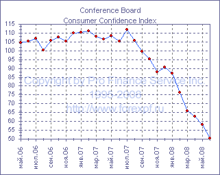 Индекс потребительского доверия Conference Board, опубликованный сегодня, продемонстрировал неожиданное падение и в июне составил 50.4 пункта, оказавшись заметно хуже среднего прогноза в 56.4 пункта и 58.1 пункта (прим. ProFinance.ru: пересмотрено с 57.2 пункта), при этом индекс текущих условий упал с 74.2 пункта до 64.5, а индекс ожиданий составил 41.0 после 47.3 пункта. Отчет, по мнению Яна Шэффердсона, экономиста HFE, является ужасным и свидетельствует о влиянии роста цен на бензин и продукты питания, а также роста запасов и цен на жилье. Значения показателя ожиданий в 41.0 пункта оказалось минимальным с начала ведения данных с 1967 года, предполагая сокращение потребления на 3.0% г/г. Между тем, индекс достаточности рабочих в июне составил 14.1 пункта после 16.1 ранее, а индекс сложности при поиске рабочей силы вырос с 28.3 пункта после 30.5 ранее. Индекс запланированных покупок, тем временем, продемонстрировал снижение, как в части планируемых покупок автомобилей (4.8 пункта против 5.1 пункта в мае), так и в части индексов планирумых покупок жилья и крупной техники, которые составили 2.2 и 27.9 пункта после 2.4 и 33.6 пункта соответственно. Индекс однолетних инфляционных ожиданий, между тем, остался на уровне 7.7%. Источник: ProFinance.Ru - Новости рынка Форекс