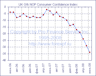 Опубликованный сегодня индекс потребительского доверия Gfk в Великобритании продемонстрировал очередное падение и в июне достиг многолетнего минимума в -34 пунктов после -29 пунктов в мае, что также оказалось хуже среднего прогноза аналитиков в -31 пункт (прим. ProFinance.ru: рекордный минимум был зафиксирован в марте 1990 году на уровне -35 пунктов). Согласно отчету, все пять компонентов в июне также продемонстрировали отрицательную динамику и достигли многолетних минимумов. Так индекс оценки финансовой ситуации за последние двенадцать месяцев упал до -17 пунктов после -11 в мае, индекс оценки экономической ситуации в последние двенадцать месяцев составил -66 пунктов после -58 ранее, а аналогичные индексы в контексте ожиданий на следующие двенадцать месяцев упали с -4 до -9 и с -39 до -45 пунктов соответственно. Индекс климата для крупных покупок, между тем, составил -35 пунктов после -32 в мае. Рэчел Джой, аналитик NOP, комментируя отчет, отмечает, что ухудшение настроений потребителей является следствием рост инфляции, неблагоприятных перспектив процентных ставок, а также растущих цен на коммунальные услуги, топливо и продукты питания, при этом она выражает сомнение в том, что в ближайшем будущем стоит ожидать изменения наблюдаемой ныне тенденции.Источник: ProFinance.Ru - Новости рынка Форекс
