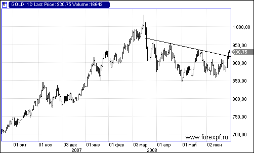 Золото начало понедельник на позитивной ноте, предприняв попытки продолжить восходящее движение, которые были поддержаны слабостью американской валюты и ростом цен на нефть к новым рекордным максимумам выше $143.00 за баррель. Как результат цены на споте достигли отметки $935.28 за тройскую унцию, однако пробиться выше максимумов мая в районе $935.30 быкам не удалось, что спровоцировало некоторую коррекцию, и теперь металл торгуется около $929.34, продолжая, тем не менее, ощущать интерес к покупкам при попытках снижения. Неспособность золота продолжить снижение ниже $850 на протяжении последних нескольких месяцев, вернула уверенность быкам, и, в то время как попыток коррекции в направлении $917/916 исключать не стоит, после прорыва линии шеи перевернутой головы и плеч на дневном графике, есть риски дальнейшего роста в направлении коррекционных максимумов апреля/марта этого года в области $952.85/955.05, тогда как прорыв выше откроет дорогу в направлении $1000 за тройскую унцию. Источник: ProFinance.Ru - Новости рынка Форекс
